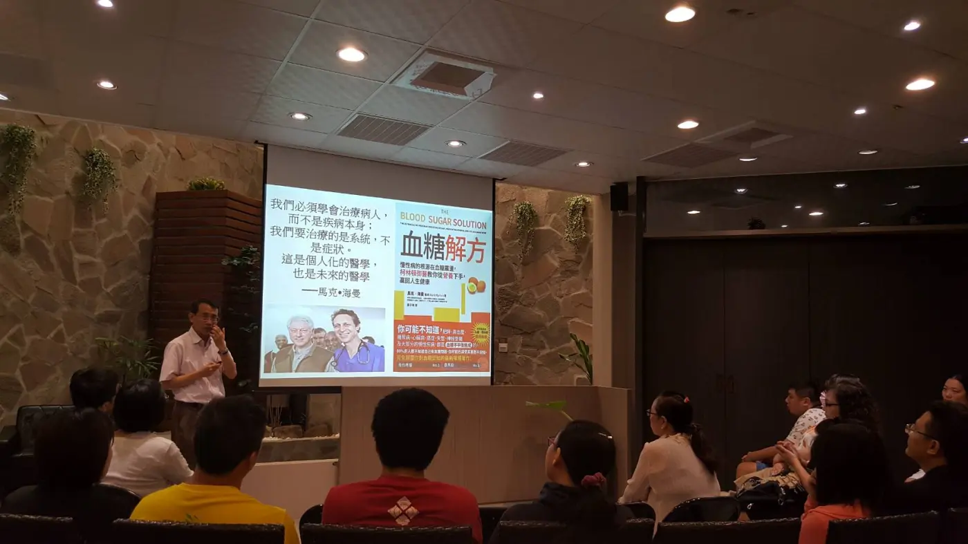 糖代謝失調引起的慢性病肥胖、高血壓、糖尿病、心臟病、癌症、失智、神經受損及大部分的慢性疾病,都是「血糖不平衡」造成的。80%的人都不知自己有血糖問題,你可能已深受其害而不自知。糖胖症(diabesity) : 肥胖會增加胰島素阻抗,已被視為第二型糖尿病的主要推手,因此醫學專家將糖尿病(diabetes)合併肥胖(obesity)稱之為「糖胖症」。食品業者為了風味佳會在食品裡添加過量的糖;為了讓食品耐放,會抽光食物原有的纖維質。糖成癮了嗎?不妨自我檢視一下1.看到甜食,不吃一塊,內心感到掙扎?2.養成攝取糖分的習慣,總是要坐在電視前吃個布丁或巧克力?3.總有些時候,少了糖就不對勁,不吃糖就無法繼續做事?4.24小時不吃糖,是否感到頭痛、情緒不佳?血糖解方七步驟「重拾健康」運動透過改變食物和生活習慣來預防、逆轉,甚至治癒大部分的慢性病以團體方式進行生活療法,比利用藥物治療慢性病更有效每一個人都有能力改變自己的基因與健康,方法是改變飲食內容和方法,利用營養補充品改善生化功能和新陳代謝,多活動筋骨,練習深度呼吸,以及追求乾淨綠化的生活。講座花絮